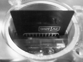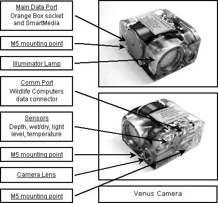 ....There are two removable covers on the Venus Camera - the main data port has a large black metal one, and the Wildlife Computers comm port has a small white Teflon one. Inside the main data port there is a 2x20 way connector for the Venus Deployment Plug and for attaching the Orange Box to the Camera. The SmartMedia Card, which stores the picture files, is inserted into a slot within the data port. The largest card that will work in this system is 64Mbyte.