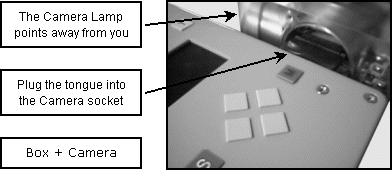 7. ....Place the Camera on the raised part of the baseboard. Turn it so that the Lamp is pointing away from you and its data port is facing the Orange box connector tongue.