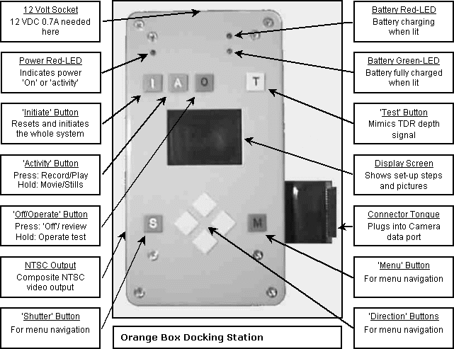 Button 'S': is the 'Shutter' button, which will be needed to make particular choices in the set-up menus. It will also take pictures while the Orange box is connected to the Camera.